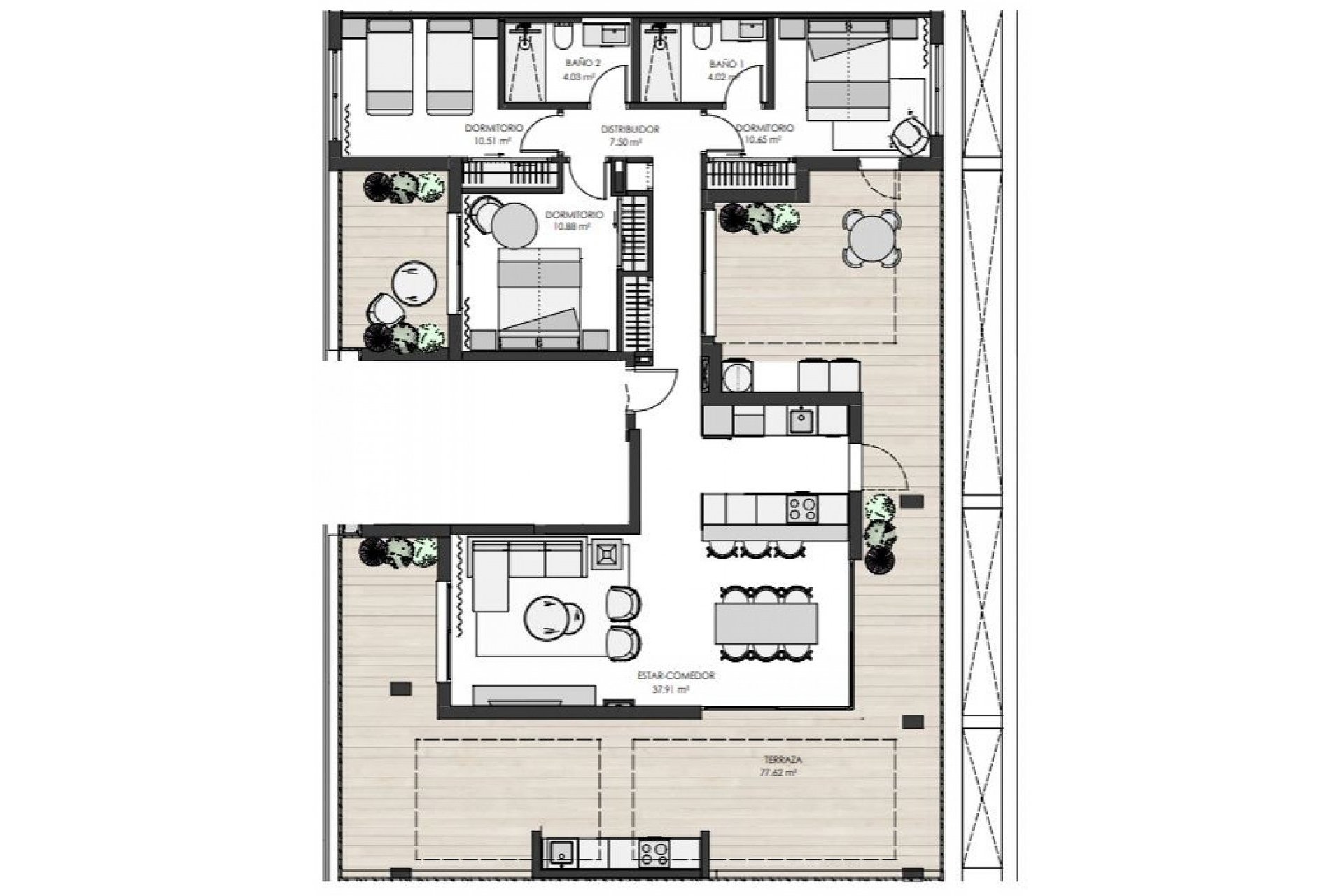 Íbúðin er með 3 svefnherbergjum og 2 baðherbergjum með hita í gólfi, bjart og rúmgott alrými með fullbúnu eldhúsi með hágæða heimilistækjum, borðstofu og stofu. Einnig fylgja mjög rúmgóðar svalir á aðalhæð sem snúa í suður. Eigninni fylgir einnig sér bílastæði í bílakjallara og geymsla, en auk þess fylgir einnig aðgangur að glæsilegum sameiginlegum garði með sundlaug og grænum svæðum með bekkjum.